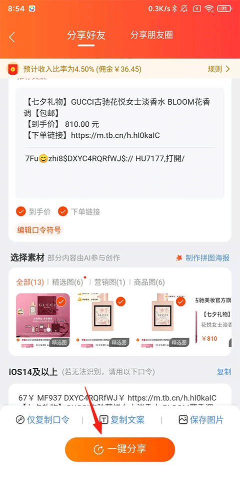 4、使用一键分享将口令分享给到微信、朋友圈、QQ、微博等社交媒体平台,当有用户点击你的链接并成功下单后就可以获得佣金;