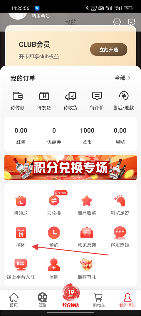 2、在个人中心页面中找到并点击【拼团】功能;