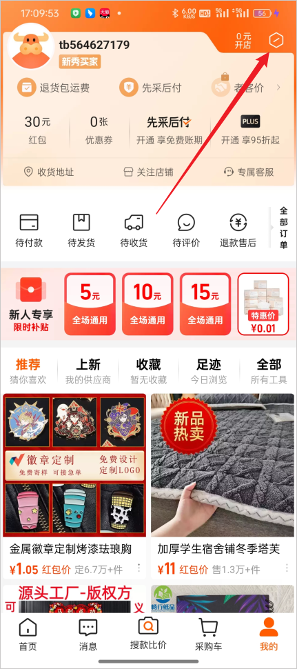 1、打开阿里巴巴1688APP,进入底部的“我的”页面。