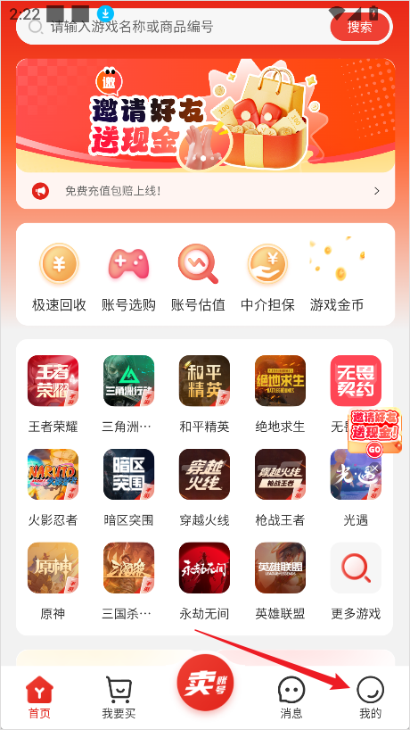 1、打开交易游App,在首页点击下方的【卖账号】;