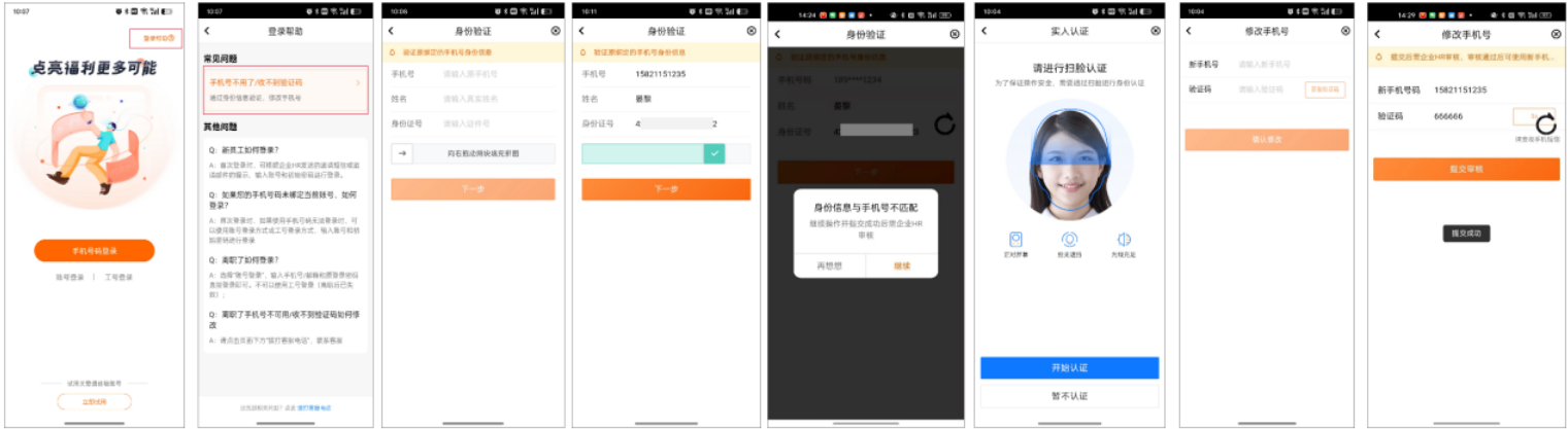 2、员工的原手机号可以登录,但无法收到验证码,且不再使用:在给到实名认证后修改,实名认证通过的流程如下。