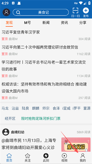 1、打开曲靖M App,点击我的