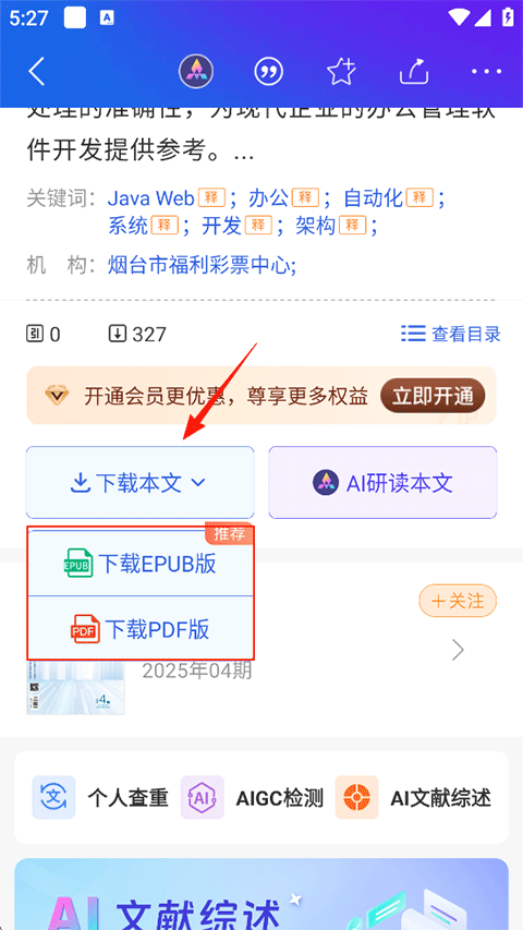 3、打开需要下载的论文,往下滑动,点击下载本文,选择下载格式即可;注意:下载论文到本地需要付费。