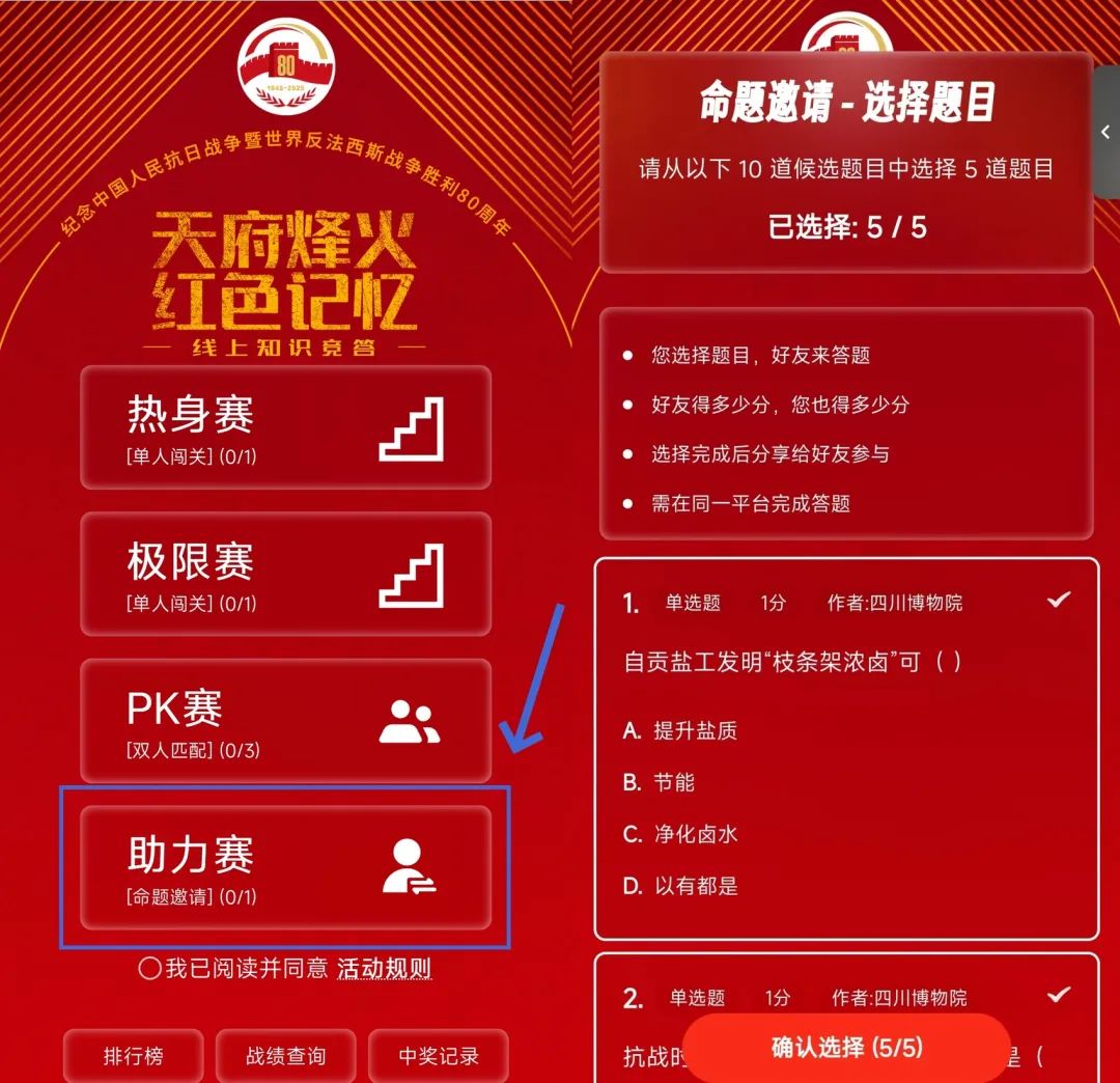 好友答题命中,你俩双向得分!区别于传统答题的“单向输出”,“助力赛”开创“发起者+应答者”双向得分模式!你可以从随机10题中精选5道“宝藏题目”,一键分享给最信任的好友;而当你作为应答者收到好友的“知识邀请”时,只需专注答题,就有机会为自己和对方同时赚取积分!一人答题,两人得分,双向奔赴,快乐翻倍!