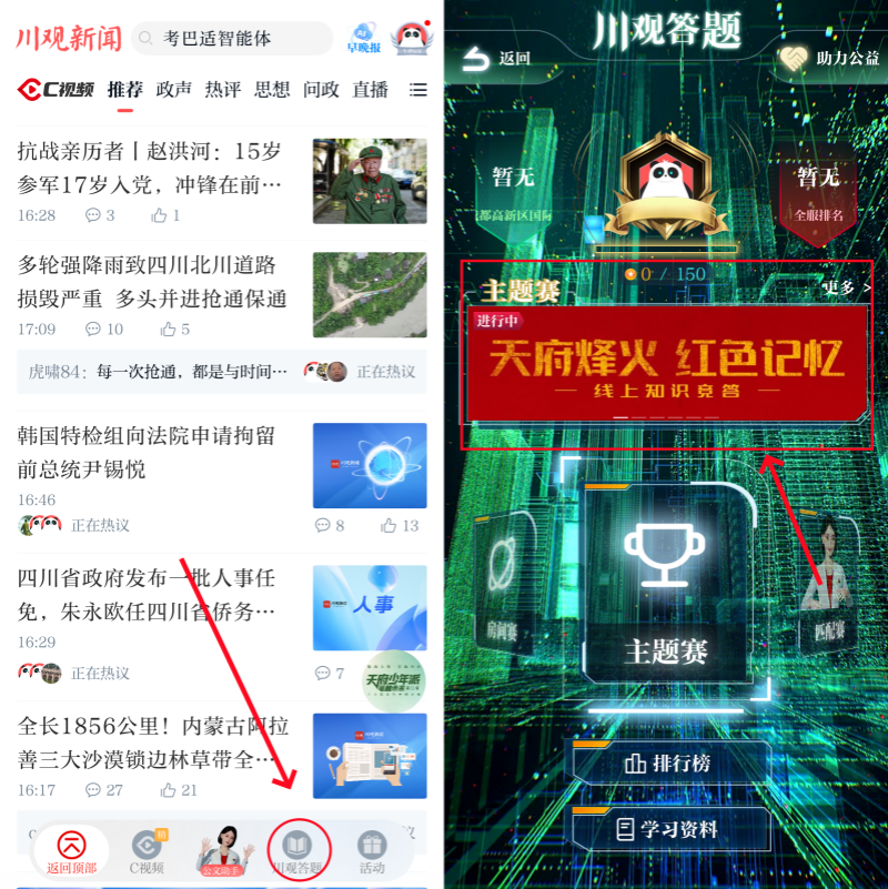 方式三:在川观新闻首页,点击下方“川观答题”,找到“天府烽火 红色记忆”互动活动图片点击参与活动即可参与。