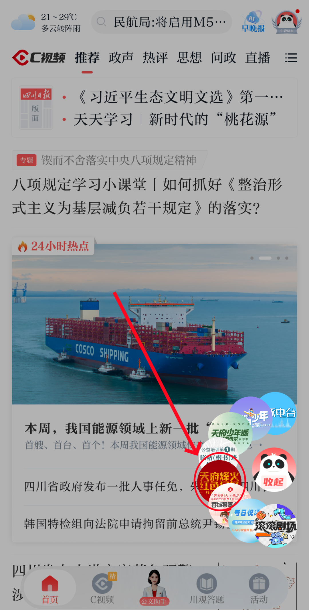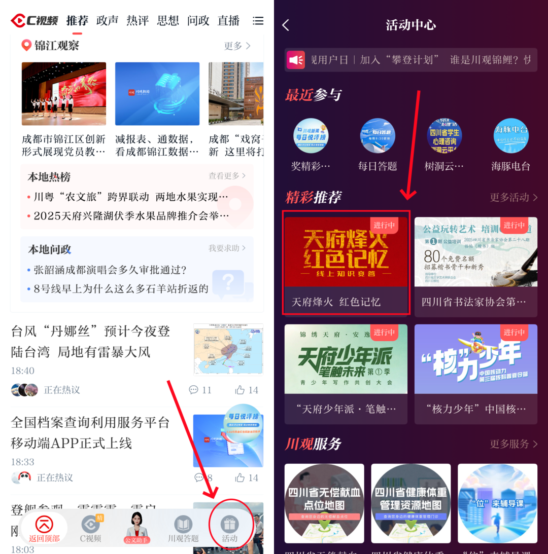 方式二:在川观新闻首页,点击右下角“活动”,进入到“活动中心”,找到“天府烽火 红色记忆”活动图片点击参与。