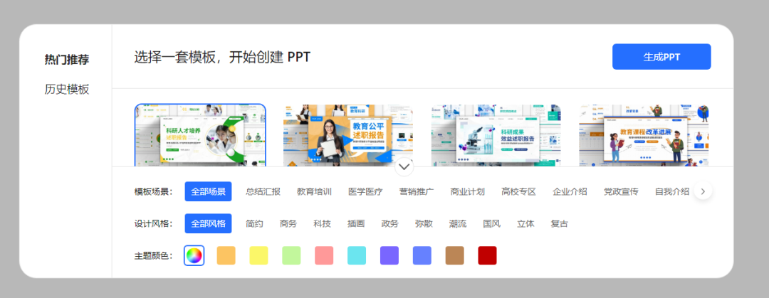 生成完大纲,点击底部“一键生成PPT”,选择PPT模版。