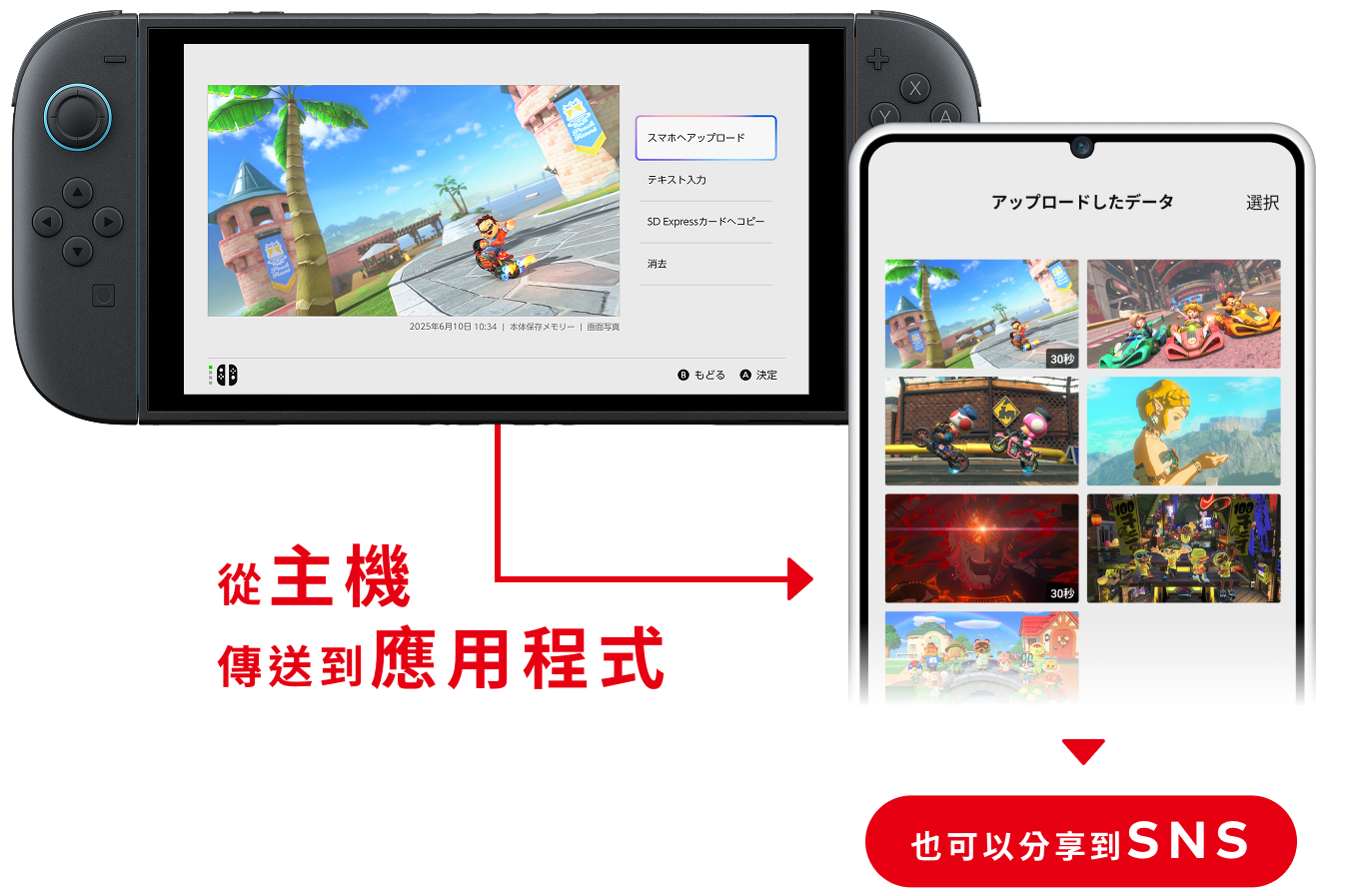 可以将保存在Nintendo Switch 2“相册”中的截图与视频发送到软件,并通过智能手机查看。