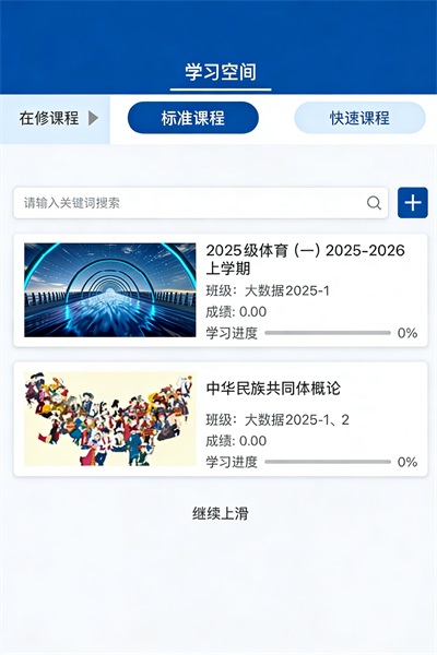 点击“教学”进入“学习空间”页面;找到“2025级体育(一)2025-2026上学期"并点击进入该课程。