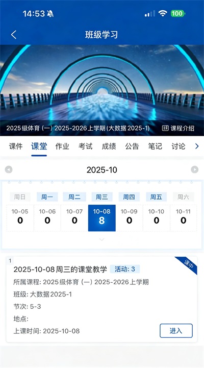 点击“课堂”进入"班级学习”页面;找到当天所开启课堂教学,点击“进入”进入今日课堂教学。