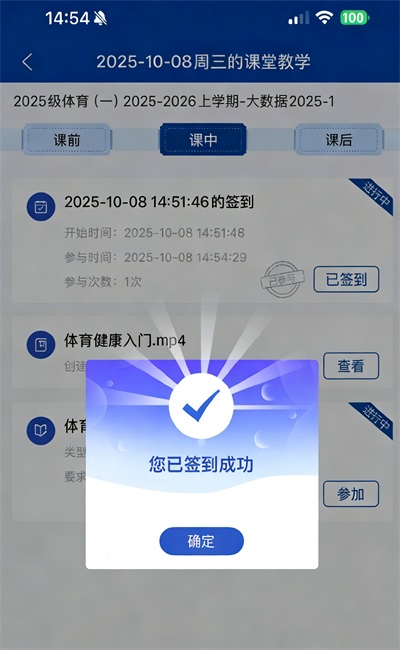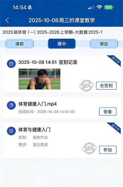 返回“课堂教学”界面,检查是否完成签到检查作业获得成绩。