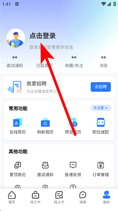 2、在我的页面,点击头像旁的点击登录,进入登录页面。