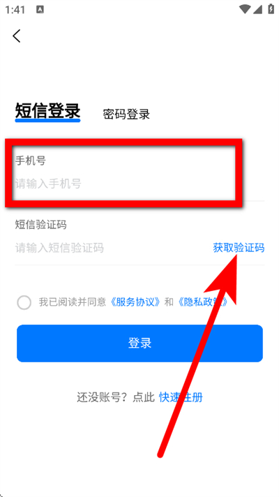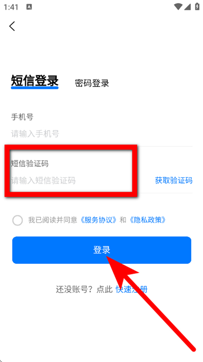 4、输入收到的短信验证码,勾选同意相关协议,点击登录,完成账号登录。