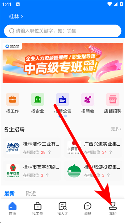 1、打开桂林人才网,点击底部导航栏的我的选项。