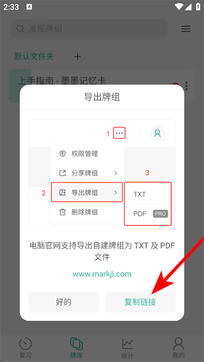 4、选择导出格式,点击复制链接,完成牌组导出操作。