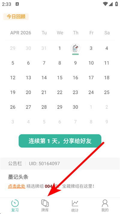 1、打开墨墨记忆卡app,点击底部牌库,进入牌组管理页面。