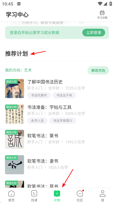 3、切换到计划页面,可查看推荐学习计划,根据自身兴趣方向,选择对应课程开启系统学习。