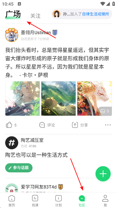 4、点击社区按钮,进入广场页面,浏览用户动态与话题,参与互动交流,分享学习感悟与心得。