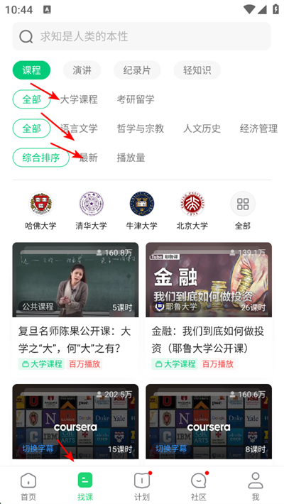 2、点击底部找课按钮,可筛选课程类型与排序方式,查看国内外名校课程,按需选择学习内容。