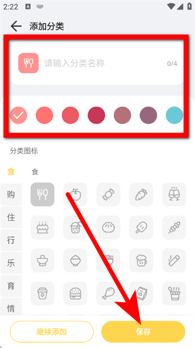 4、输入分类名称,选择分类颜色,点击保存,完成自定义分类添加。