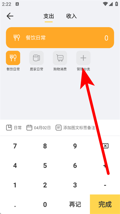 2、在记账页面,点击管理分类选项,进入管理页面。