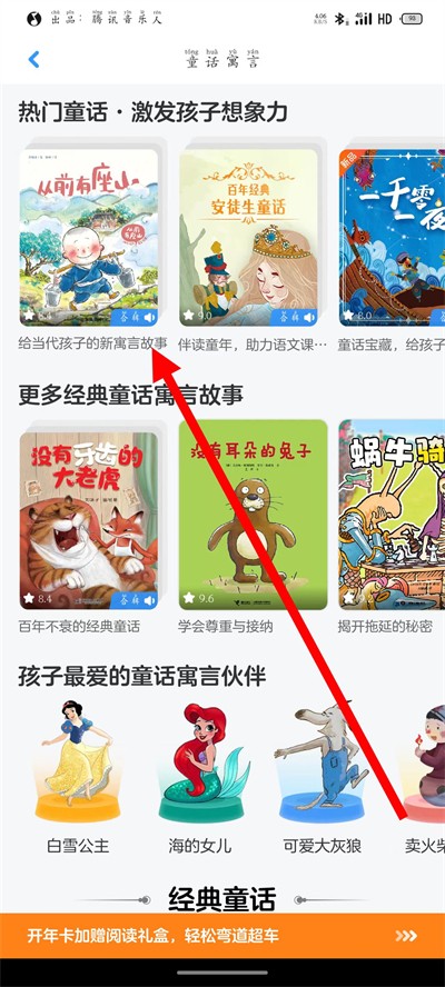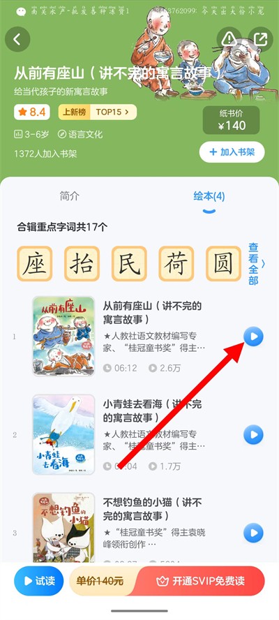 2、在童话寓言分类页面,点击想要查看的绘本封面,进入绘本详情页面。