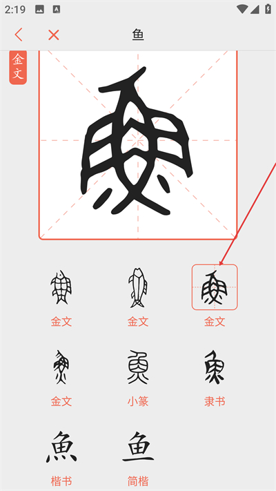 3、字形演变页面点击对应金文样式,查看不同书体书写细节,深入了解汉字字体的传承与变化。