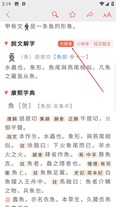 4、说文解字页面点击大徐本标签,查看说文解字等古籍中对鱼字的权威注解,掌握字源本义。