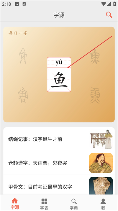 1、字源APP首页点击鱼字卡片,进入该字详细学习页面,开启汉字溯源学习。