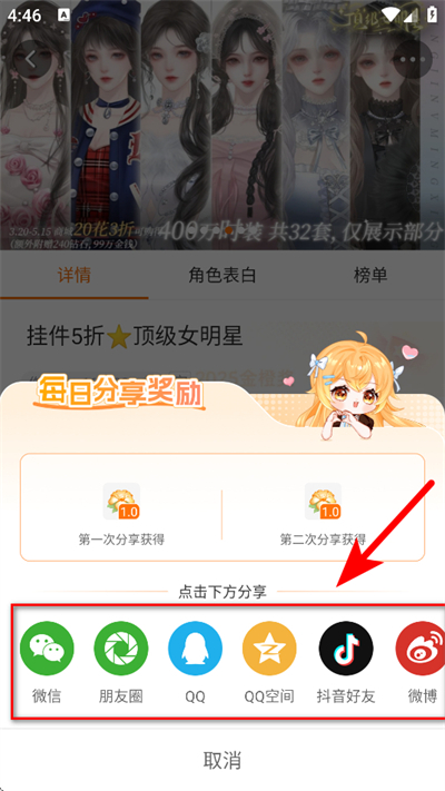 4、选择对应分享渠道,完成分享,领取每日分享的免费鲜花奖励。
