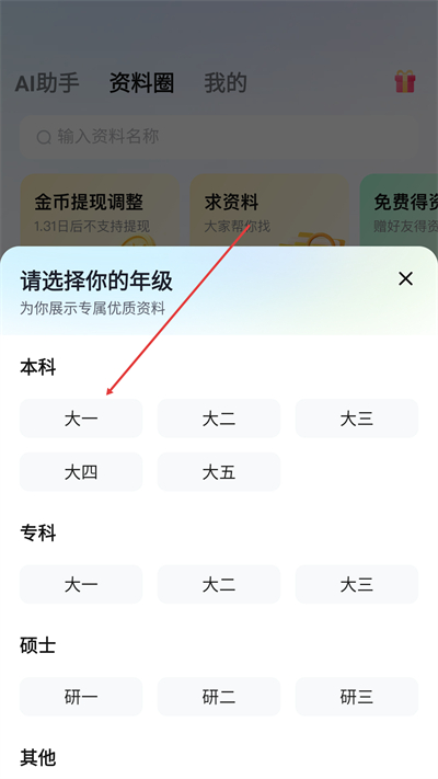 2、年级选择弹窗中,根据自身学习情况选定大一等对应年级,展示专属优质资料。