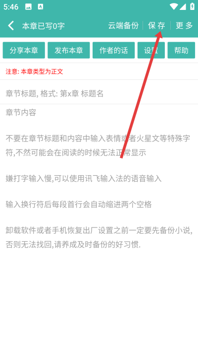 4、填写章节标题和内容后,点击右上角保存按钮,完成章节创建。