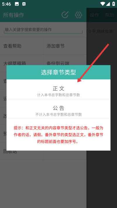 3、根据需要,将章节设为正文或公告类型,以便计入总字数和章节数。