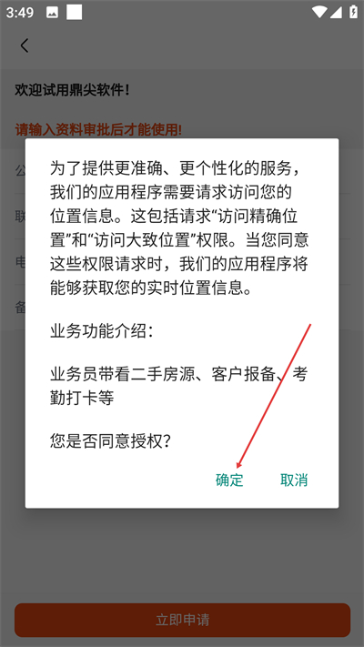 2、在位置权限授权弹窗中,点击确定,授予应用位置权限,保障业务员带看、打卡等功能正常使用。
