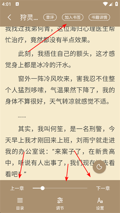 4、在阅读界面可查看小说正文内容,使用上一章下一章目录调节设置等功能,还能加入书签方便后续阅读。
