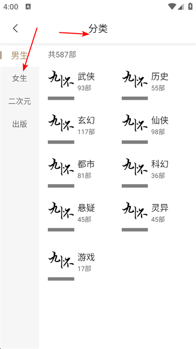 2、点击分类按钮,可进入分类页面,按男生女生等大分类,再选择武侠玄幻悬疑等细分品类,筛选对应小说。