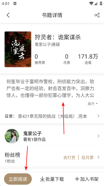 3、进入书籍详情页,可查看小说封面作者简介等信息,点击立即阅读进入正文,也可批量下载或加入书架。