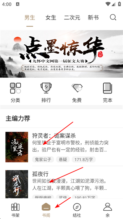 1、打开软件默认进入书阁页面,可切换男生女生二次元等分类,浏览主编力荐的各类小说,快速找到感兴趣的作品。