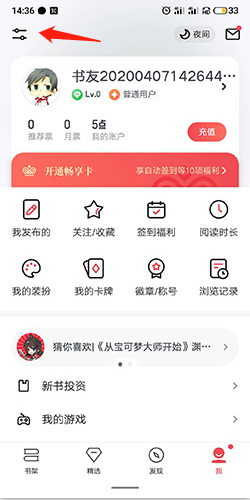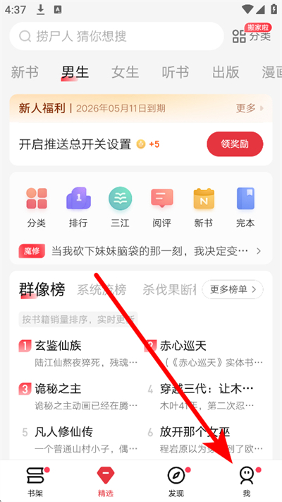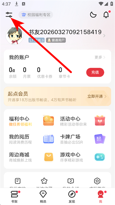 1、打开起点读书,点击右下角我,进入个人中心页面。