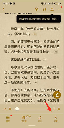 2.在小说阅读页面中,点击屏幕任意位置,点击左下角“目录”,打开目录即可选章节