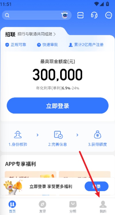 1、 打开招联金融,点击下方右侧“我的”,进入页面。