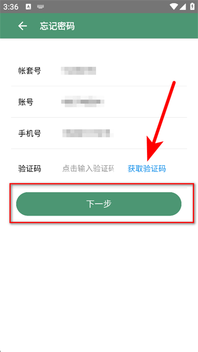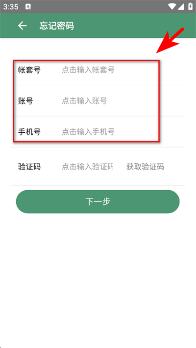 2、密码找回页面,依次输入帐套号、账号、手机号。