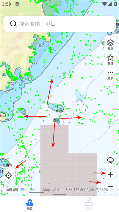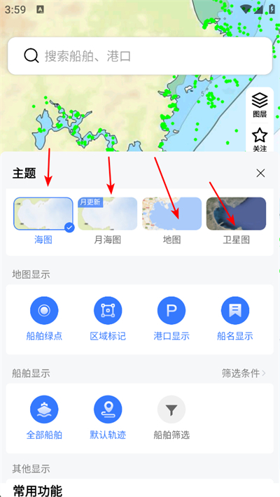 2、点击图层选项,可切换海图月海图地图卫星图等样式,也能设置船舶绿点区域标记等显示模式,调整地图展示。
