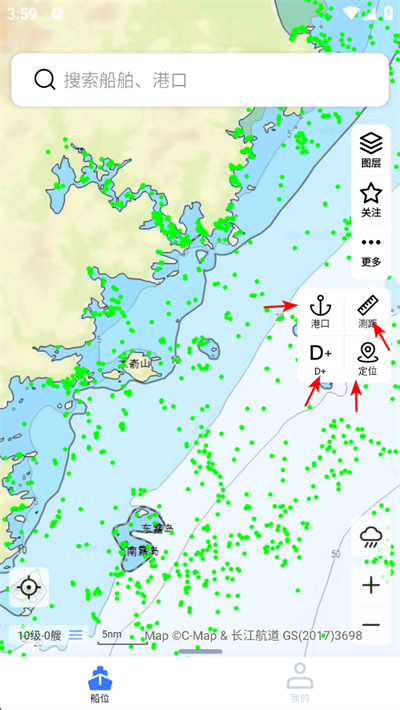 3、在地图界面可使用港口测量定位等功能,能对目标位置进行标记测量,也可查看周边船舶和港口的具体信息。