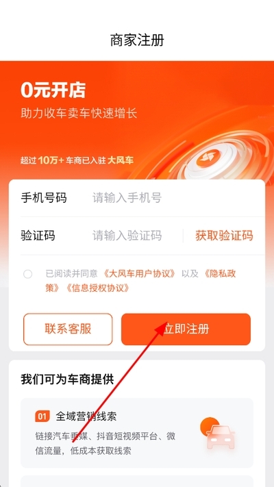 1、打开软件进入,展示合作车商信息,直接注册,进入商家注册流程。