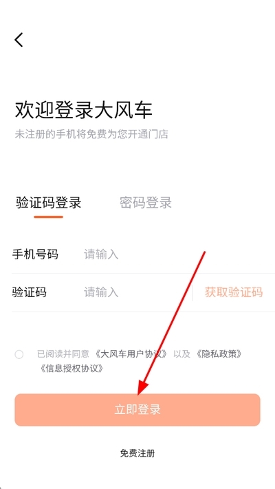 2、注册输入手机号,获取并填写验证码,完成商家账号注册。