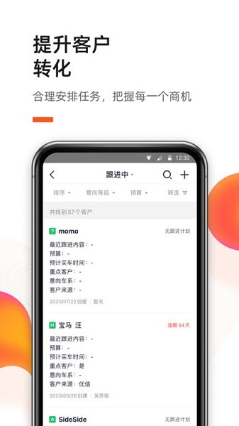 - 客户管理。提供客户基本信息、购车意向、销售过程、跟进记录等数据的管理。