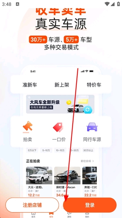4、未登录状态下可浏览车源,如需操作交易或开店,输入信息后立即登录即可。