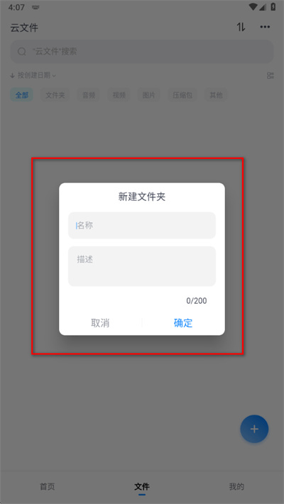 4、点击新建文件夹,输入名称与描述,确认后即可创建专属文件夹,方便分类存储与管理云盘文件。