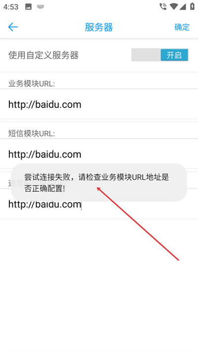4、填写完所有模块URL后,系统会自动校验地址,若地址错误会提示尝试连接失败,请检查业务模块URL地址是否正确配置。